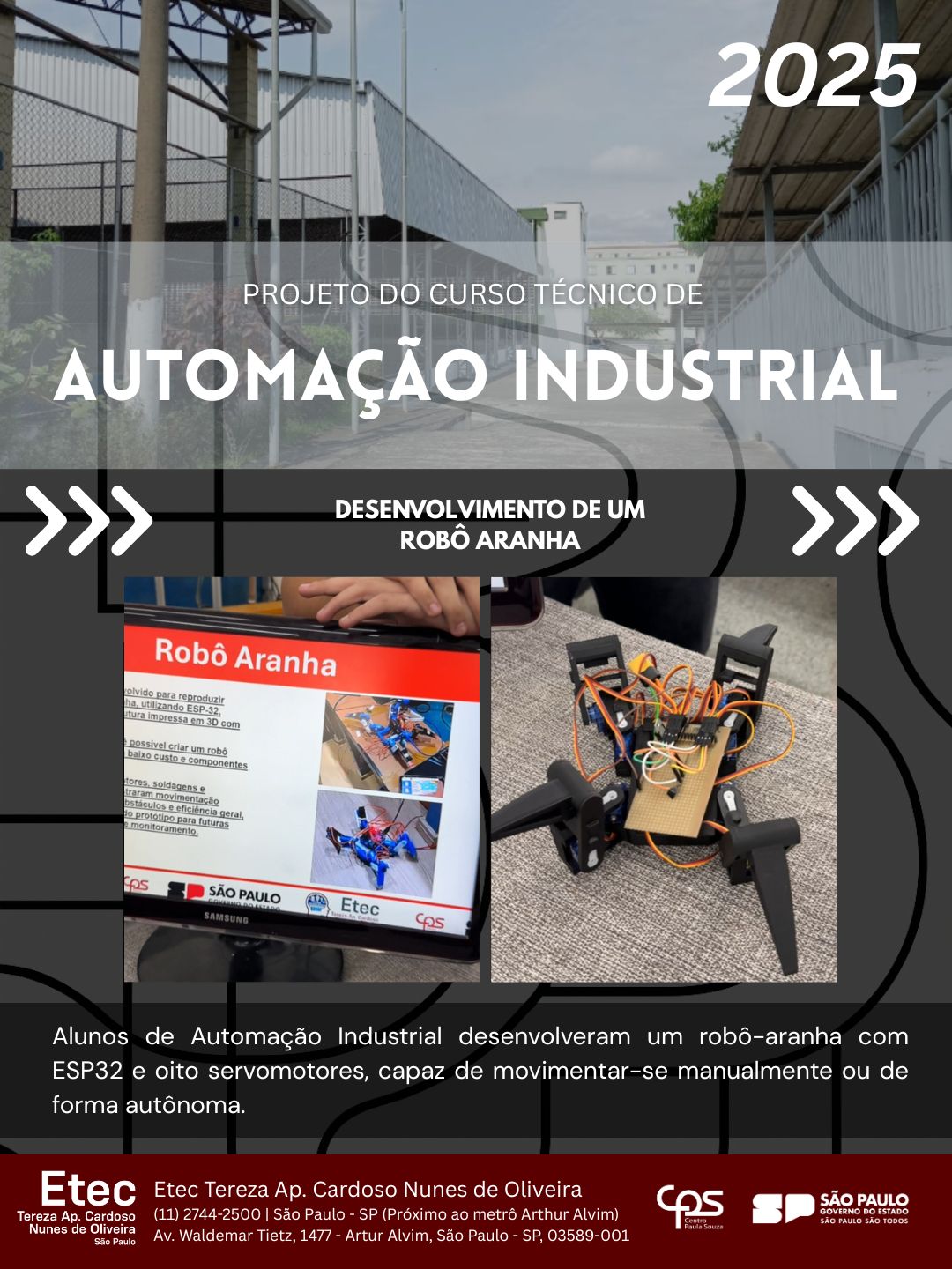 Alunos de Automação Industrial desenvolveram um robô-aranha com ESP32 e oito servomotores, capaz de movimentar-se manualmente ou de forma autônoma.